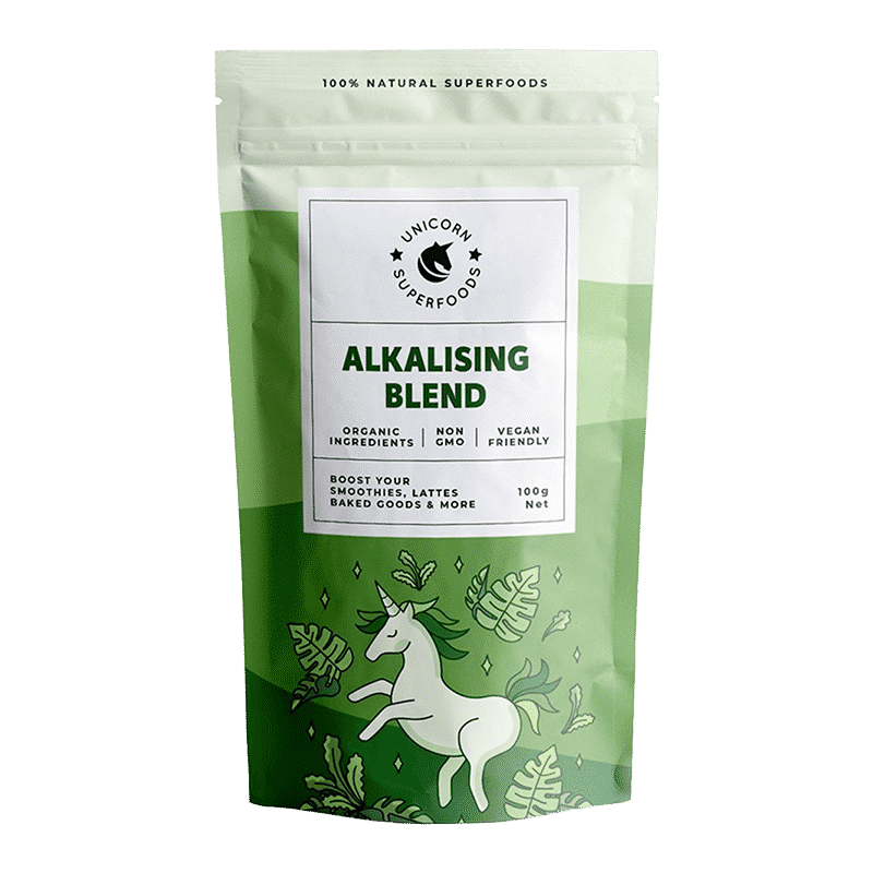 Alkalising Blend is a cleansing blend made with organic ingredients that detoxify the body and regulate metabolism. Contains a source of antioxidants, magnesium, B vitamins, iron, zinc, Vitamin C, and calcium.