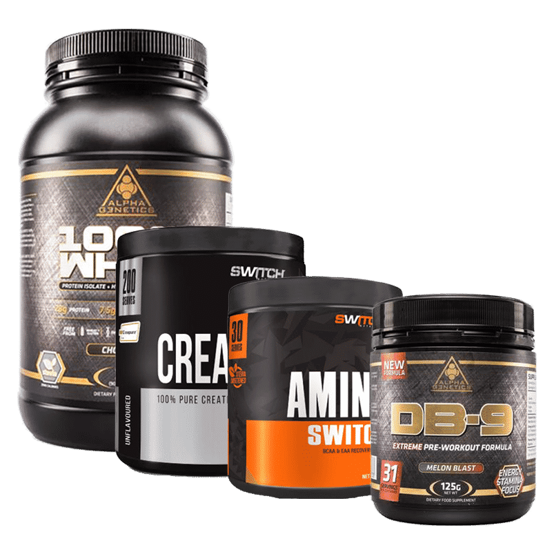 Our DB9 Gym Bundle is the ultimate way to reach peak performance on the court or in the gym. This bundle will get you flying with the DB9 Pre-workout to increase focus, energy and stamina while allowing you to recover with the Amino Switch BCAA & EAA fully. Using the Creatine and Alpha Genetics Whey mix will grow some serious lean muscles!