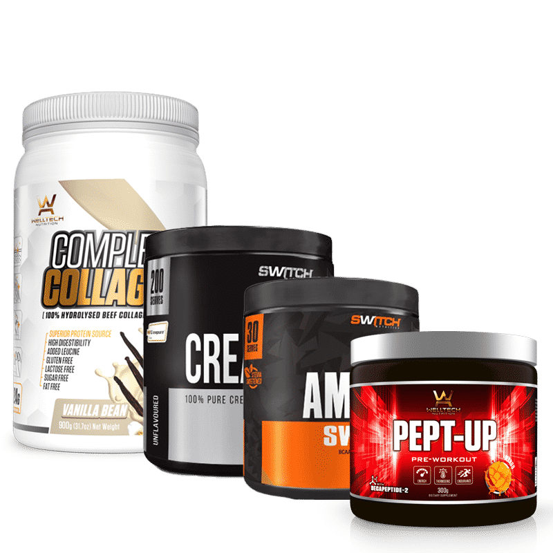 Our Pept-Up Gym Bundle is the ultimate way to reach peak performance on the court or in the gym with the Amino Switch BCAA & EAA. Using the Creatine and Complete collagen mix will help you tone and grow lean muscles!