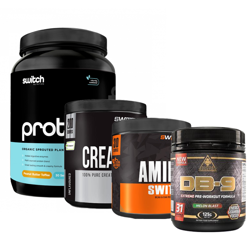 Our Vegan Gym Bundle has been designed specifically for anyone who is vegan and is 100% free of any animal products. This bundle will get you flying with the DB9 Pre-workout to increase focus, energy and stamina while allowing you to recover with the Amino Switch BCAA & EAA fully. Using Switch Creatine and the Green Planet Plant Protein mix will help you tone and grow lean muscles!